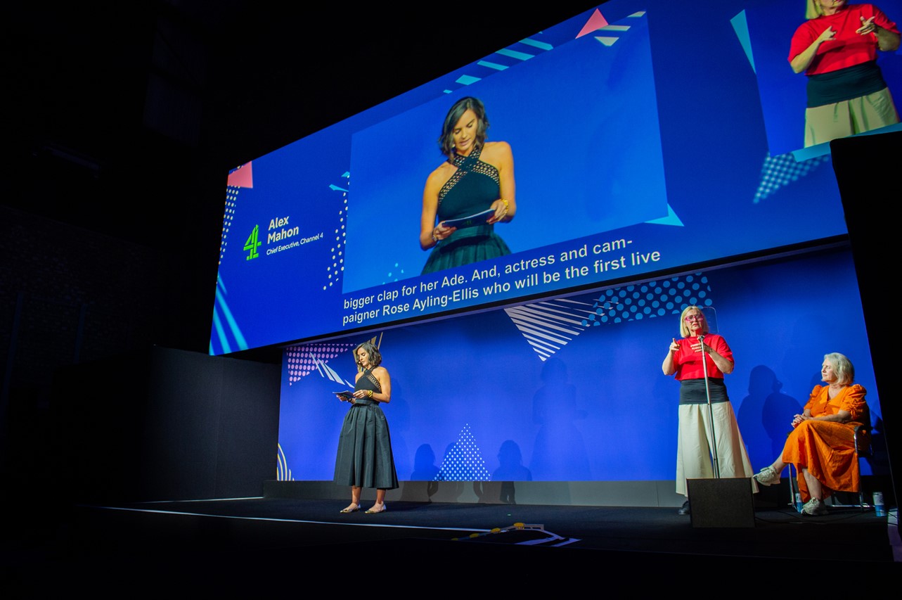 The event, hosted by Adam Hills, was made inclusive for all guests attending in person and online, with all presentation content featuring live BSL from our Deaf BSL Interpreter Clare, with live captions and live audio description. By providing these communication services, Channel 4 ensured the event was accessible to the Deaf community.